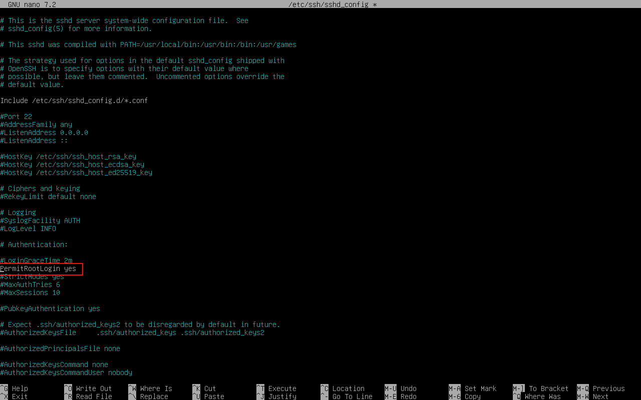 执行nano /etc/ssh/sshd_config,将PermitRootLogin行前面的#注释去掉,并把后面的** prohibit-password **改为yes。这样就可以允许root用户登录了。接着我们执行systemctl restart ssh重启ssh服务,使配置生效。