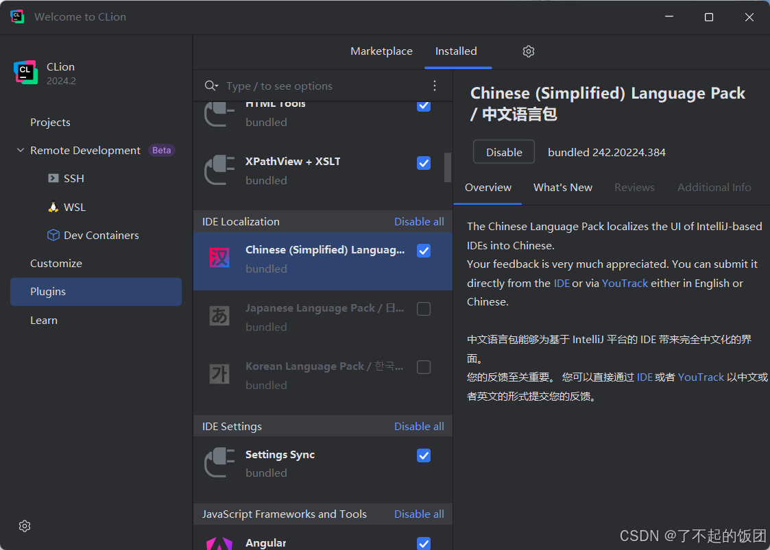 今天下载了一个CLion2024.2,上来第一件事就是改中文,去搜索chinese发现自带语言包了,然后界面也还不是中文的,禁用插件后再启用发现没有重启工具生效按钮。